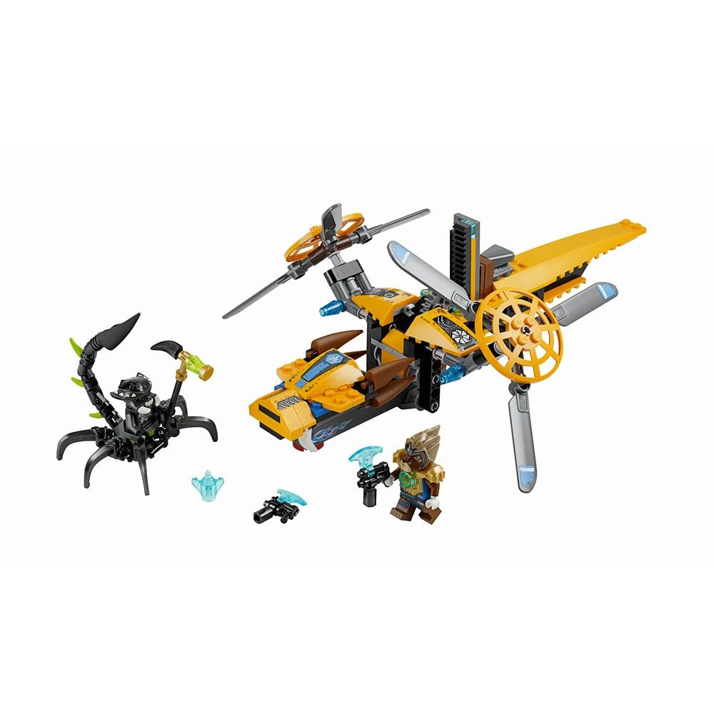 У Лавертуса есть ЧИ, и он готовится убежать от Скуттера на своем суперклассном двухвинтовом вертолете. Выстрели из спаренных ЧИ-пушек в сторону вертолета и посади Лавертуса на место пилота. Нажми пусковой рычаг, чтобы лопасти винта включились и вертолет взлетел вверх. Но остерегайся - Скуттер получил жалящий молот и прыгает вверх, чтобы украсть ЧИ. В набор входят 2 минифигурки с оружием: Лавертус и Скуттер.
