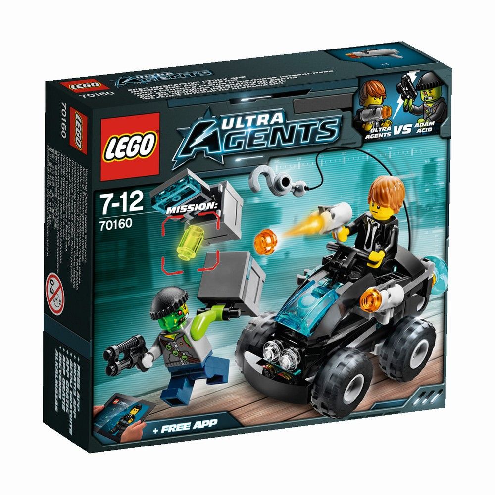 Срочный вызов новичка ультраагента Макса Бернса. Адам пытается украсть емкости с токсичными элементами из доков города Астор для своей хазяйки-суперзлодейки Токсикиты. Отправляйся в погоню на невероятном квардроцикле и реактивном гоночном автомобиле 2 в 1 и помешайте этому прибрежному нападению! Выпускайте шутеры из машины или сохраните их и используйте в качестве ручного оружия. Включите функцию разделения гоночной машины и отправляйтесь в полную приключений погоню по воде. Присоедините заднюю лебедку, чтобы оттянуть гоночный автомобиль назад, а потом, когда найдете исчезнувшие емкости, оттяните их лебедкой в безопасное место. В набор входят 2 минифигурки с оружием: агент Макс Бернс и Адам Асид.