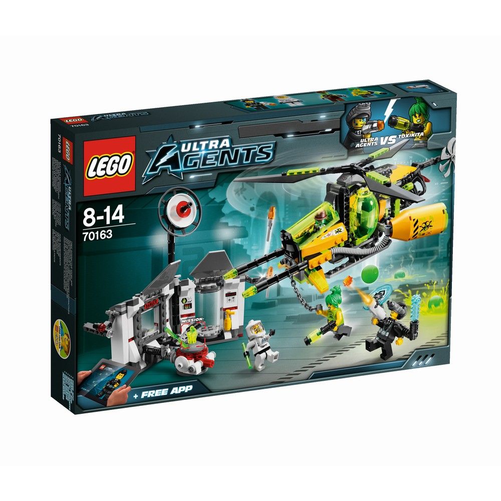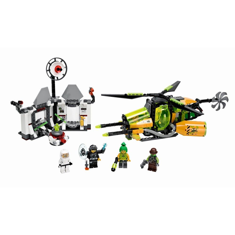 Явиться на дежурство, ультраагент Кертис Болт! Злая Токсикита нашла сверхсекретную лабораторию на острове Поинтер и сбрасывает токсичные ракеты из своего вертолета, которым руководит ее сторонник Ретокс. Внутри лаборатории ученый из города Астор проводит важные эксперименты с помощью дистанционного управления. Отправляйтесь ему на помощь и защитите кристалл, который пытается украсть Токсикита, чтобы вставить его в супероружие, - это оружие может быть очень разрушительным, если попадет не в те руки! Стреляйте из шутера и маневренными ракетами, когда Токсикита начнет спускаться с вертолета по цепи. Перехватите ее, прежде чем она включит функцию взрыва, желая освободить кристалл и разрушить вдребезги всю метрополию! В набор входят 4 минифигурки с разнообразным оружием и аксессуарами : Токсикита, Ретокс, агент Кертис Болт и ученый из города Астор.