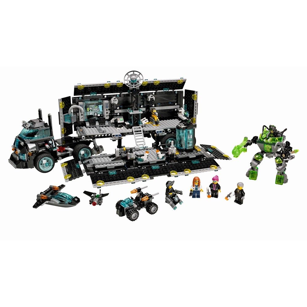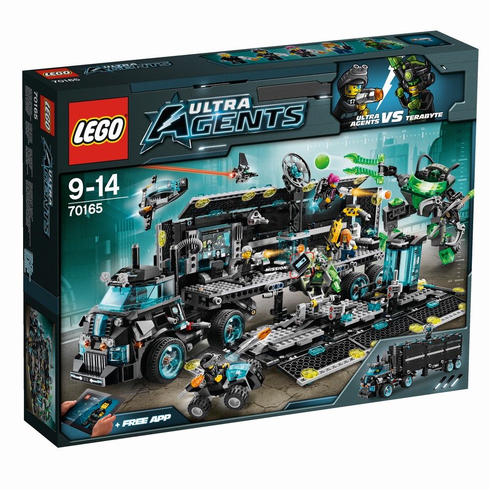 Чрезвычайное положение! Злой кибернетический хакер Терабайт напал на мобильную штаб-квартиру миссий ультраагентов, чтобы разрушить всю коммуникационную сеть города Астор. Переведите высокотехнический грузовик в маскировочный режим и запустите автоматические ракетометы, чтобы отразить нападение. Запустите скрытый самолет, чтобы следить за врагами с воздуха. Толкните рычаг, чтобы отцепить кабину водителя и открыть заднюю часть грузовика и увидеть, как выглядит штаб-квартира. Подключите ноутбук, на котором хранятся сверхсекретные планы миссии, в помещении для инструктажа и просмотрите их на большом экране. Проанализируйте ключи и проведите тесты в лаборатории с профессором Кристиной Гидрон. Садитесь в автомобиль для магистралей и прикрепите к нему выдвижной манипулятор, чтобы подготовить агента Феникс к запуску. Не позвольте Терабайту убежать с ноутбуком, в котором хранятся секретные файлы ультраагентов, пока его высокотехнический робот пытается уничтожить коммуникационную систему, сбрасывая разрывные бомбы на спутниковую антенну. Запустите автомобиль по пандусу и стреляйте из орудий, чтобы защитить штаб-квартиру ультраагентов. Вам надо бросить этого преступника в высокотехническую тюремную камеру перед тем, как он принесет новые беды. В набор входят 5 минифигурок с аксессуарами: Терабайт, агент Соломон Блейз, агент Кайла Феникс, агент Кертис Болт и профессор Кристина Гидрон.