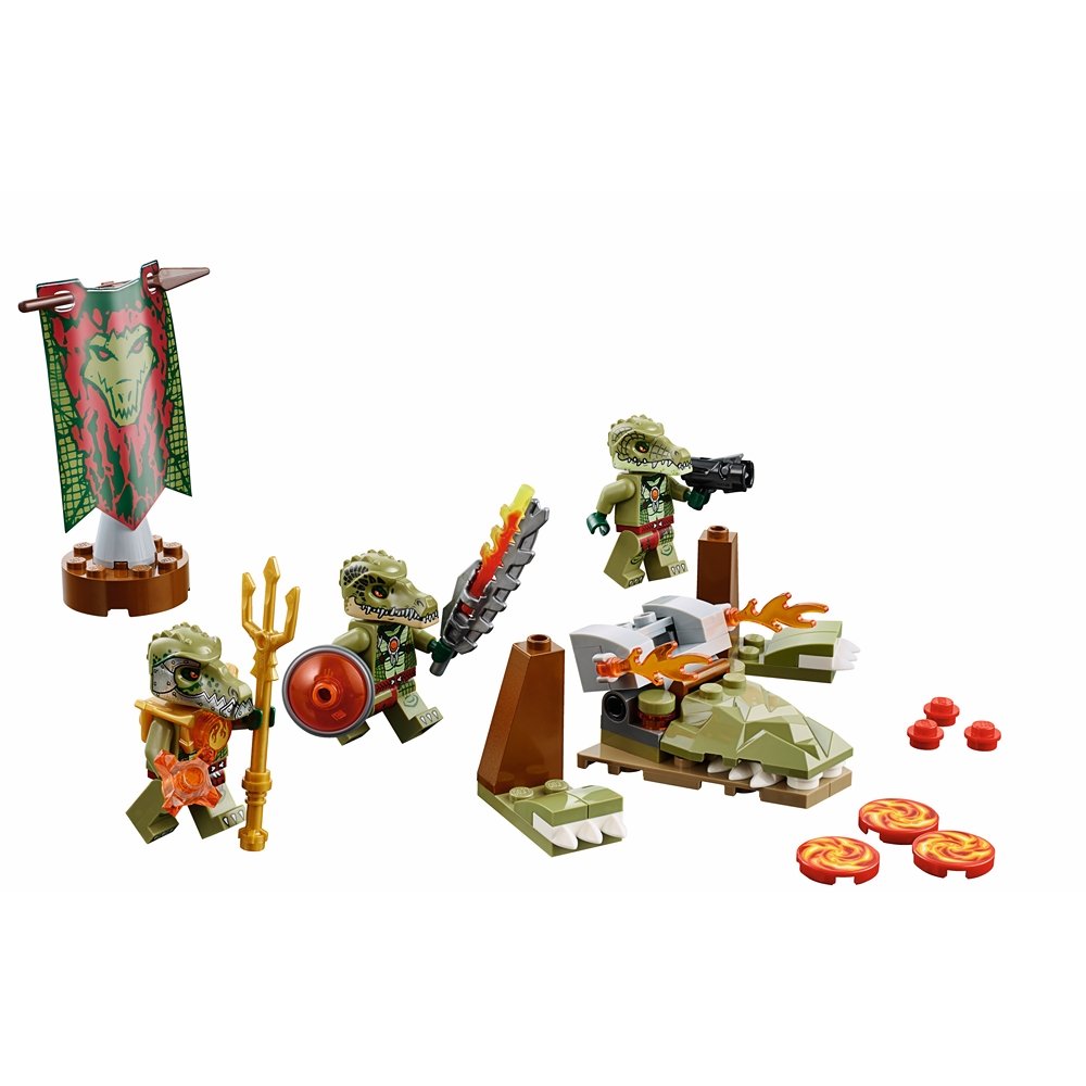 Объединитесь с кланом Крокодилов, чтобы разрушить злые намерения сэра Фангара заморозить всю Чиму! Проведите парадом ваш замечательный отряд воинов рядом с флагом клана Крокодилов. Вооружите солдат мечами, щитами, шутерами и другими орудиями генерала Крокенбурга. Спрячьтесь от атак врага за мощными ногами стенами крокодила и пользуйтесь силой дискового шутера Свомп Слингера! В набор входят 3 мини-фигурки с разнообразным оружием и аксессуарами : генерал Крокенбург и 2 крокодила-воина.