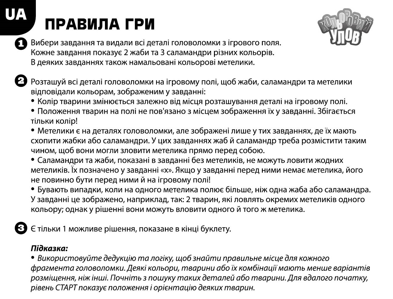 “Кольоровий улов” – головоломка, що привертає увагу приємним сюжетом. Літо, яскраві кольори навколо. В траві причаїлося безліч яскравих істот. Чи зможуть прудкі метелики врятуватися від зголоднілих жабок та ящірок? Де ховається жовта саламандра, а де червона жабка? Якщо деталь з прозорими тваринками покласти на поле, персонажі набувають кольору. Скористайся підказками, поміркуй та знайди правильне місце для кожної деталі. І не забудь, що дехто з тварин з твоєю допомогою має спіймати метелика. Бо час обідати!
